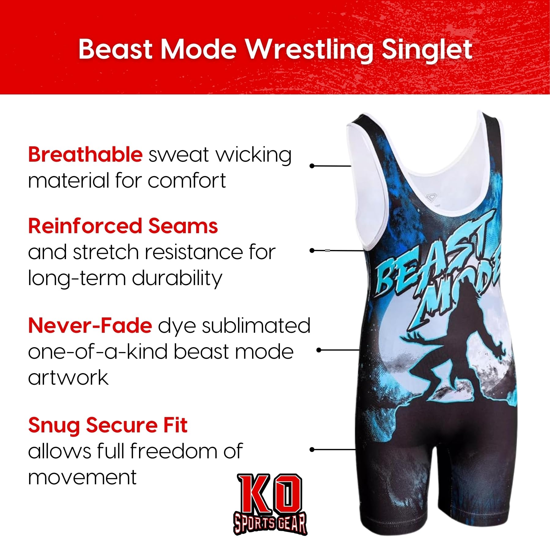 The Beast Mode Wrestling Singlet by KO Sports Gear features exclusive designs sublimated into the fabric. Therefore, your singlet won’t fade, crack, or peel.