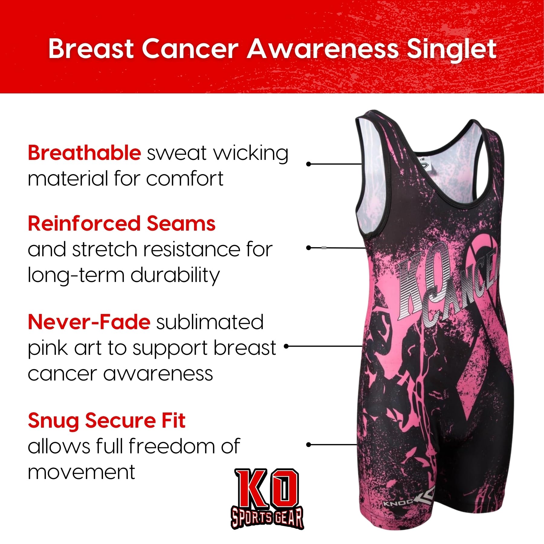 Show your support with the KO Cancer Wrestling Singlet by KO Sports Gear. Designed for athletes who want to stand out, this singlet combines vibrant style with top-tier functionality.