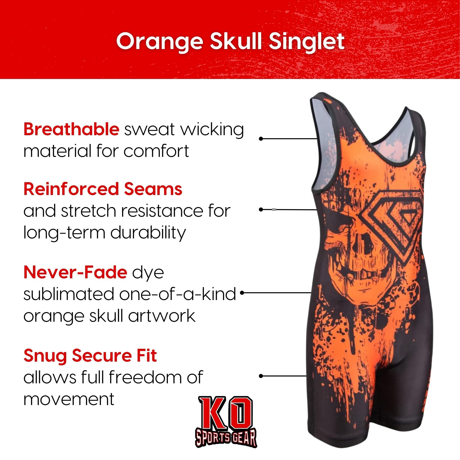 Show off your style with the orange and black Skull Wrestling Singlet by KO Sports Gear. Designed for athletes who want to stand out, this singlet combines vibrant style with top-tier functionality.